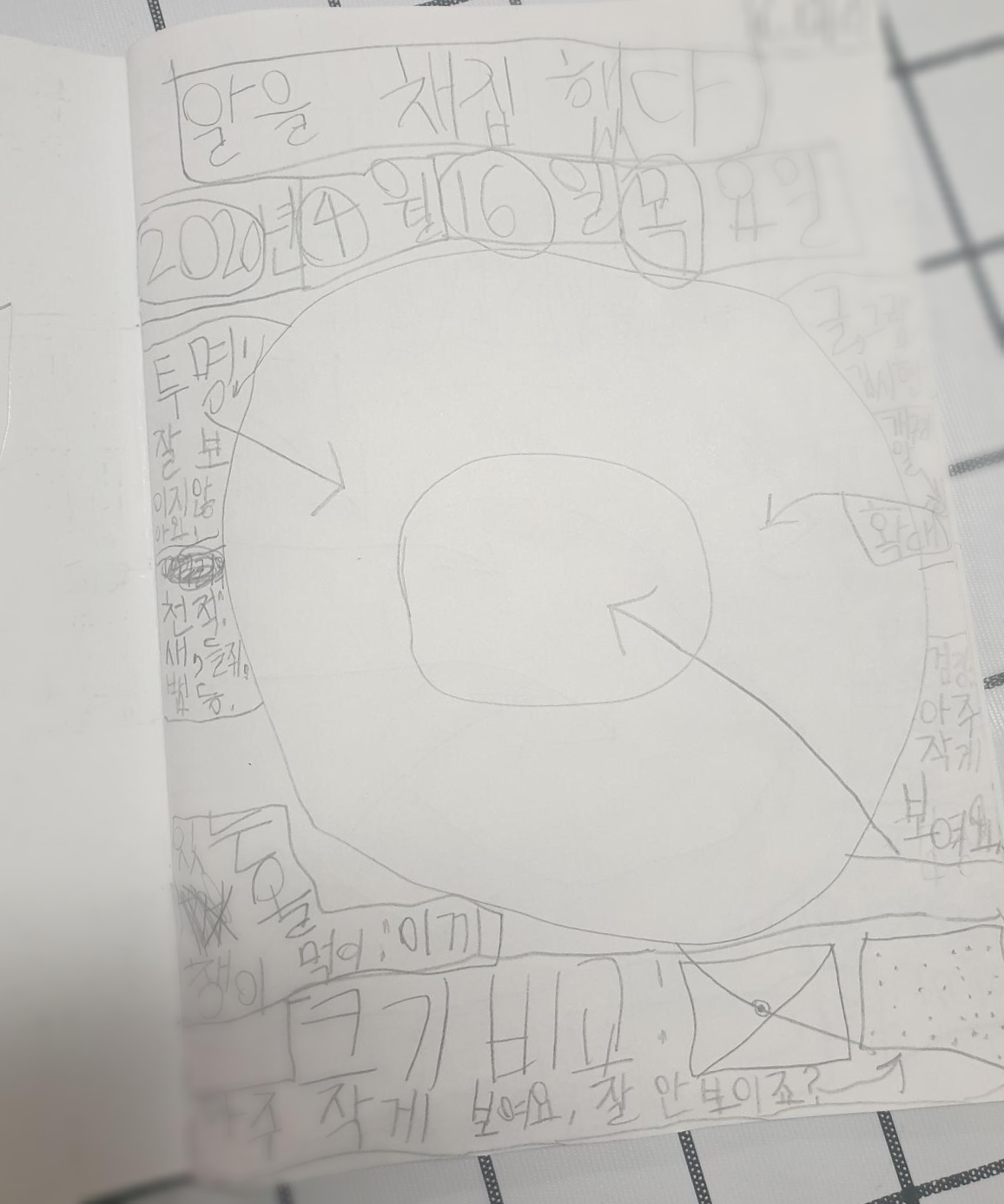 쭉쭉 써내려간 관찰일기 속에는 깨알같은 '크기비교'와, 어항 속에 있는 '올챙이 먹이'까지 적는 귀여운 세심함이 보여 한참 웃었다.