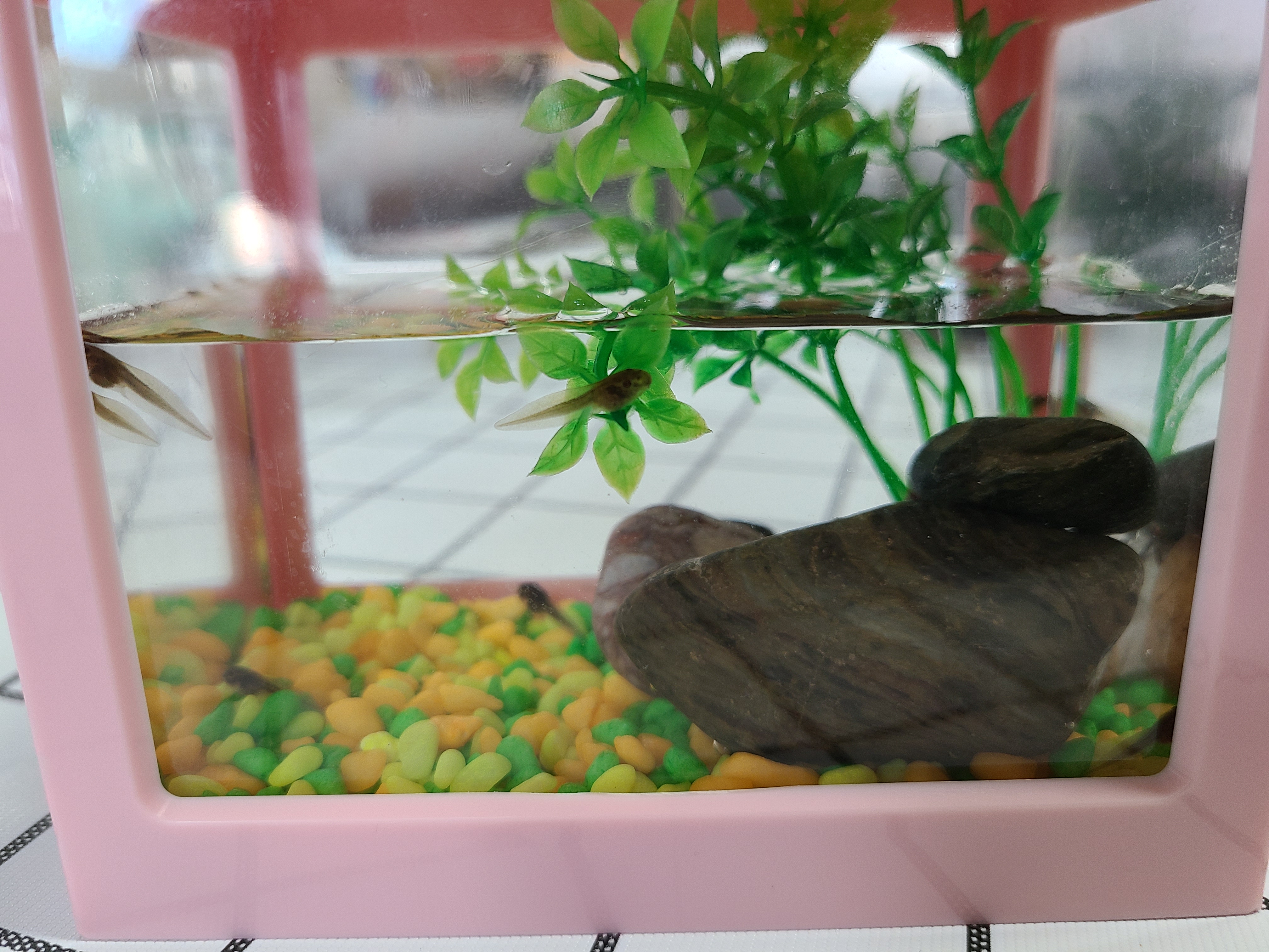 올챙이들이 돌멩이나 수초사이를 돌아다니는 것을 좋아한다해서 꾸며줬는데, 돌 틈이나 수초 뒤로 이리저리 왔다갔다 하는 모습을 보니 마음에 드나? 싶기도 하고.