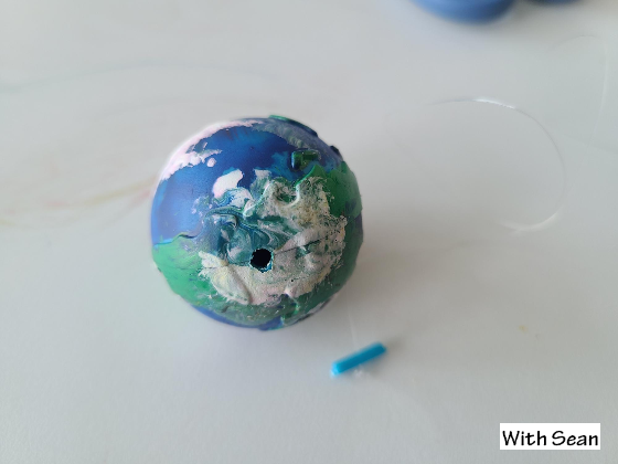 낚시줄이 고정용 막대를 끼우고 행성의 구멍난 부분에 넣으면 되는데, 지난 번 중국산 키트는 행성에 나있는 구멍이 터무니없이 작아서 결국 다 색칠한 행성을 분리했다가 낚시줄을 넣고 재조립해야 했다.
