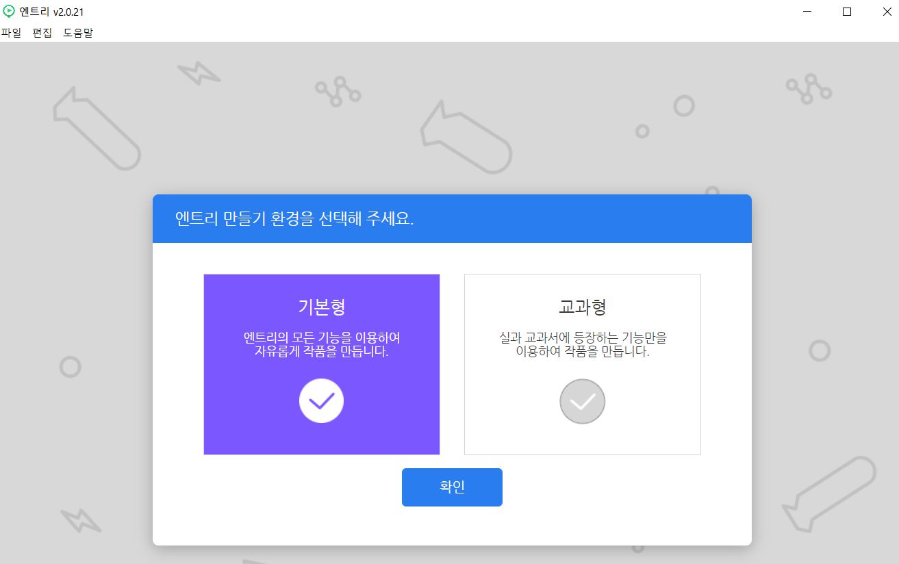 엔트리 설치가 완료된 후 실행 시, 아래와 같이 '엔트리 만들기 환경'을 선택하라고 나온다.