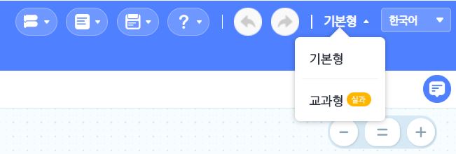 엔트리 만들기 환경은 기본형과 교과형 중 어느 것으로 선택하던지, 다시 쉽게 바꿀 수 있다. 프로그램 오른쪽 상단에 보면 내가 선택한 만들기 환경이 나오는데, 이를 클릭하면 기본형과 교과형 중 재선택이 가능하다.