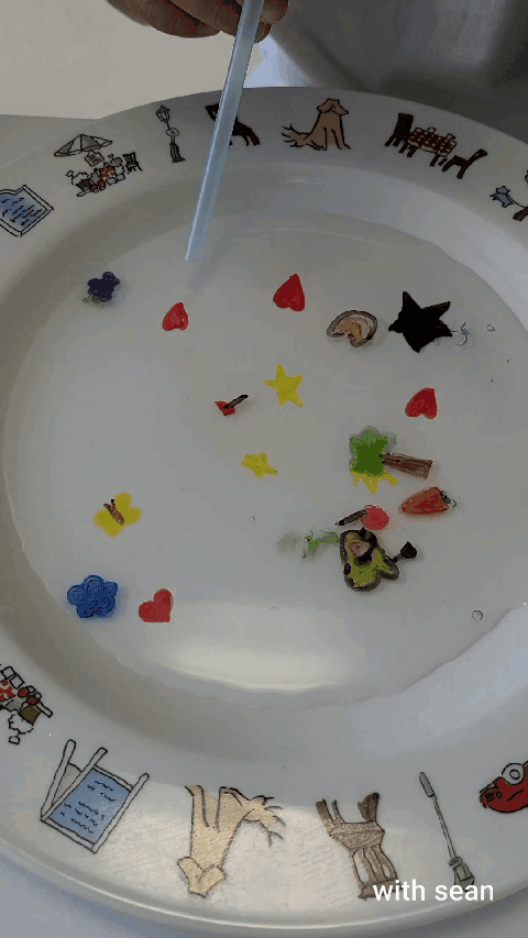 역시나 '동작'에 격한 반응하는 남자 아이.. 다 떼지지 않은 그림도 빨대를 이용해 후후 불어 물에 찰랑거림을 만들어주니 곧 떼져서 물 위를 두둥실 떠다녔다.