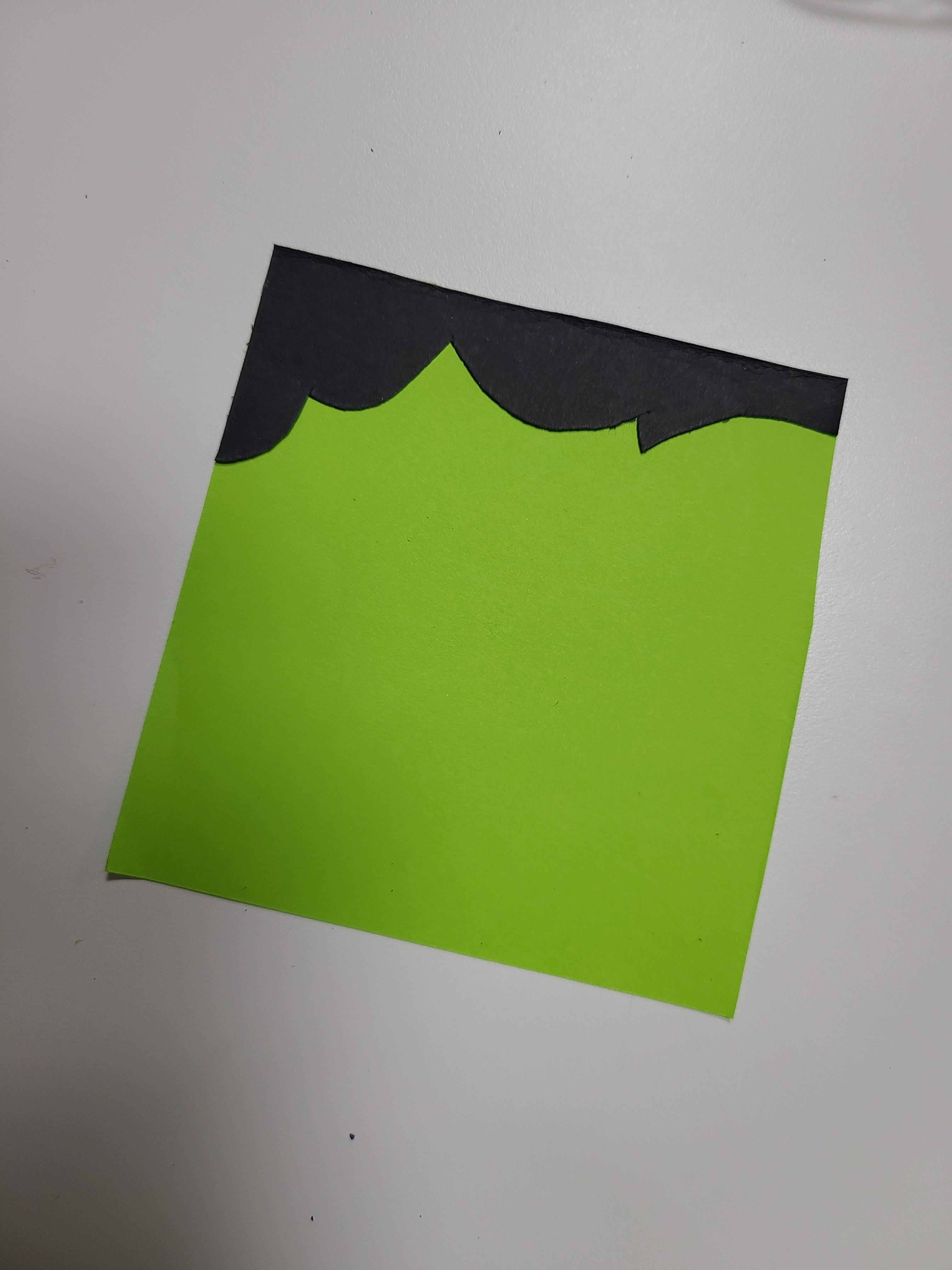 연두색 사각형 종이에 박쥐날개를 자른 자투리 종이를 붙여서 자연스럽게? 프랑켄슈타인의 머리카락 완성!