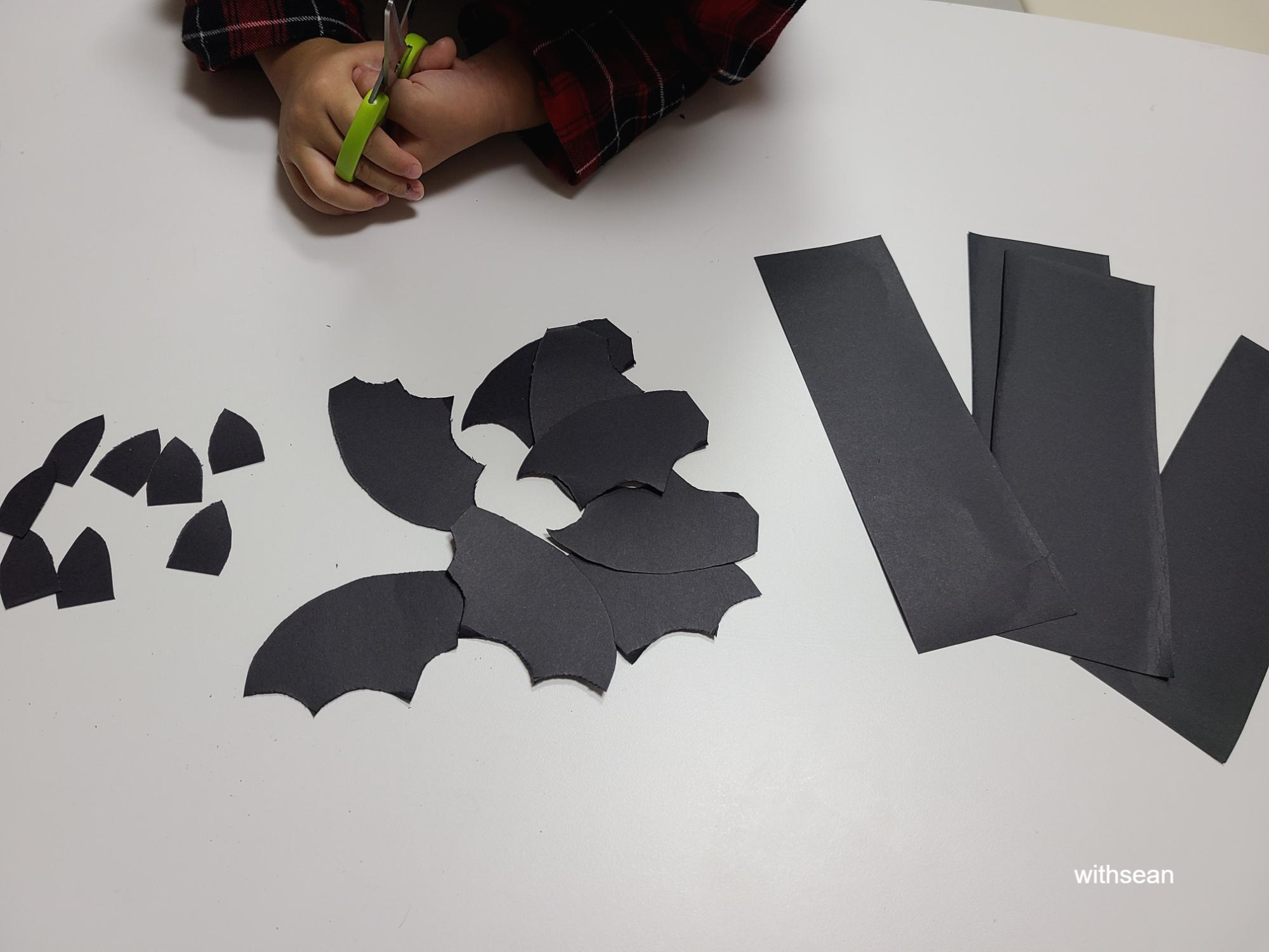 박쥐의 몸통부분, 날개, 그리고 귀 부분의 종이를 각각 잘라주세요.