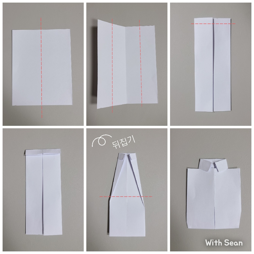 1. 반으로 접은 후 펼쳐 중앙 선에 맞추어 양쪽을 접어줍니다.