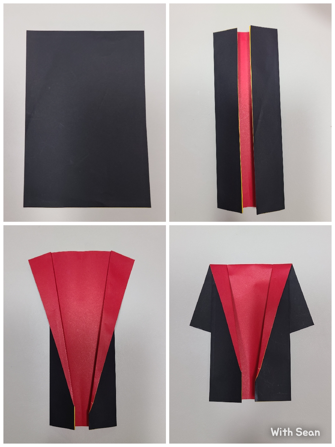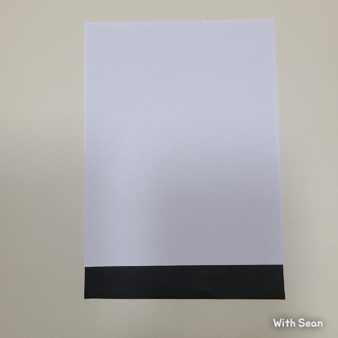 망토 느낌을 표현하기 위해 검정색 색종이와 빨간색 색종이를 붙인 후 10*15cm 크기로 잘랐습니다.