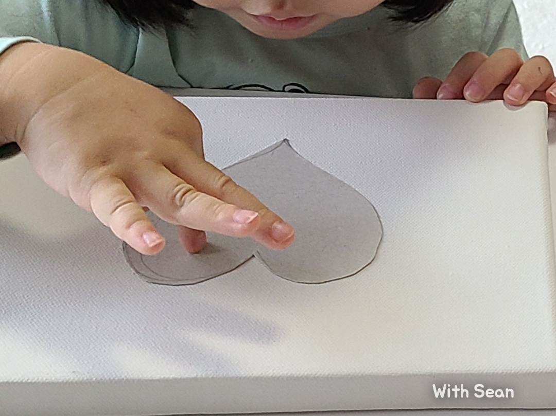 4살 슈리는 모양을 내기 힘들 것 같아 캔버스 위에 두꺼운 상자 종이로 하트를 오려 잘라붙여줬어요.