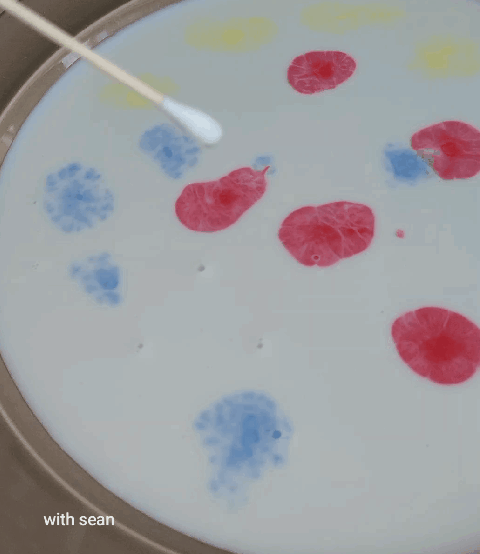 2. 우유 속에 포함되어 있는 유지방을 세제가 녹이면서, 소용돌이 치는 듯한 현상이 더 잘 나타납니다.