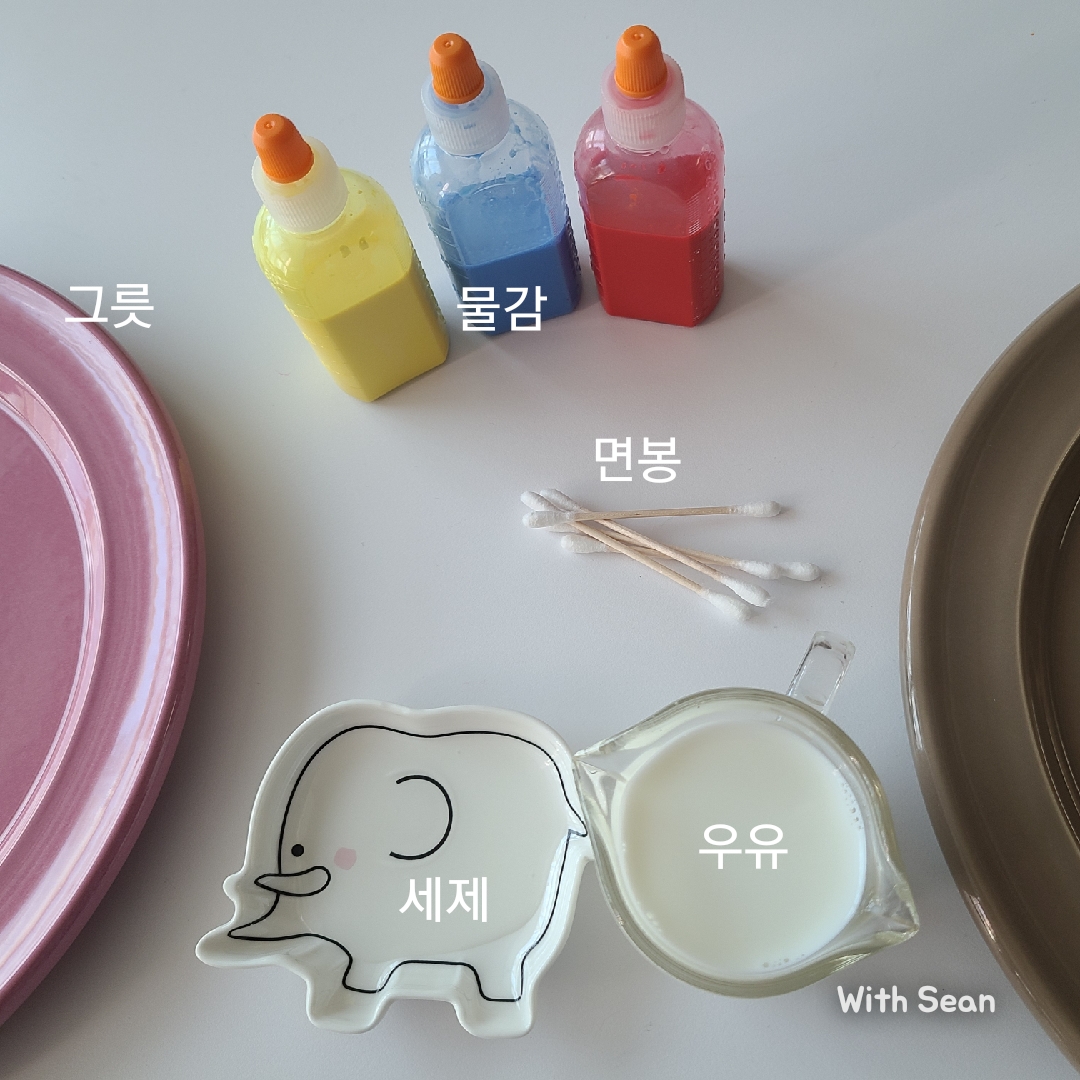 준비물 : 우유, 물감, 주방 세제, 면봉, 넓은 접시