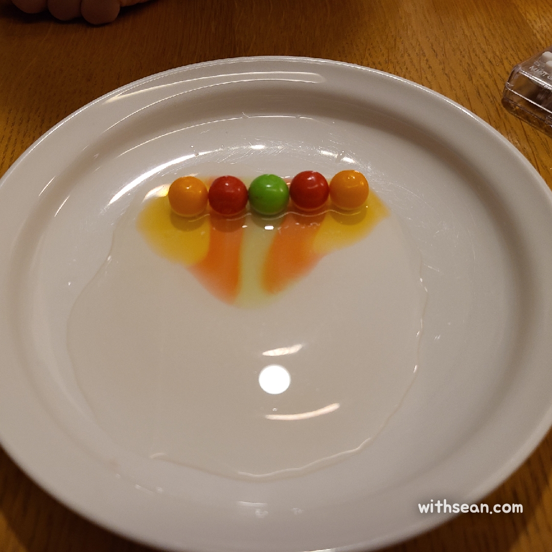 노란색 과자를 떨어뜨리니 금방 초록색 물이 되네요.