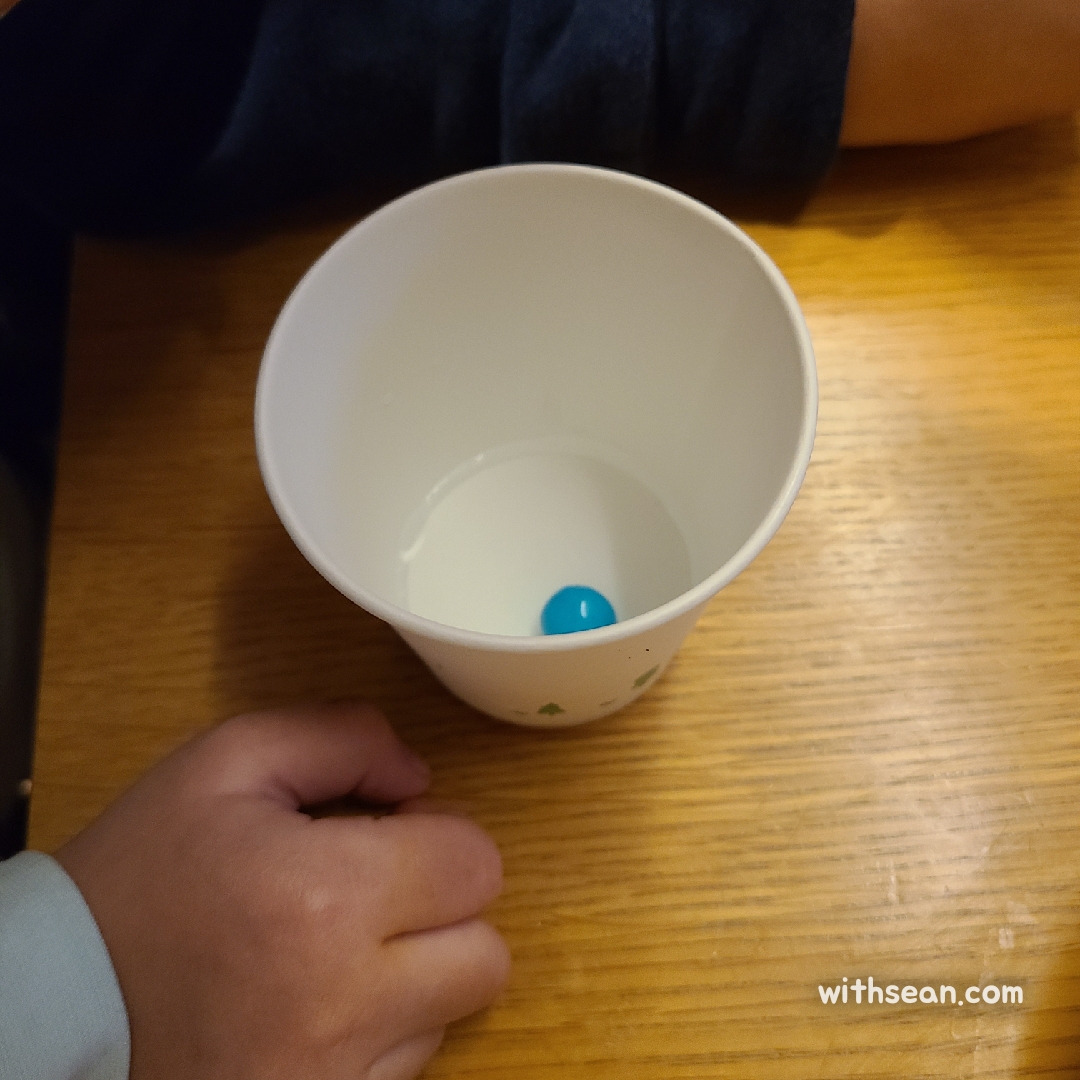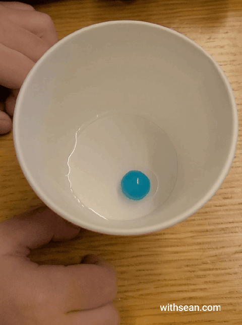 이번에는 물이 담긴 종이컵에 파란색 하나 빠뜨려볼까요?