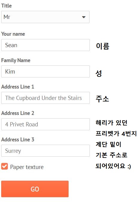 링크로 들어가셔서 이름과 주소 부분만 바꿔준 후 'GO' 버튼을 누르면 바로 멋진 호그와트 입학편지가 생겨요.
