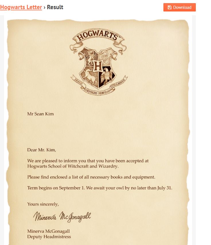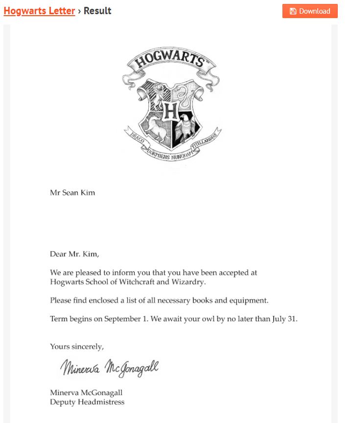 바로 Download 버튼을 누르시면 10초만에 호그와트 입학편지 만들기는 완료가 된 것이구요 :)