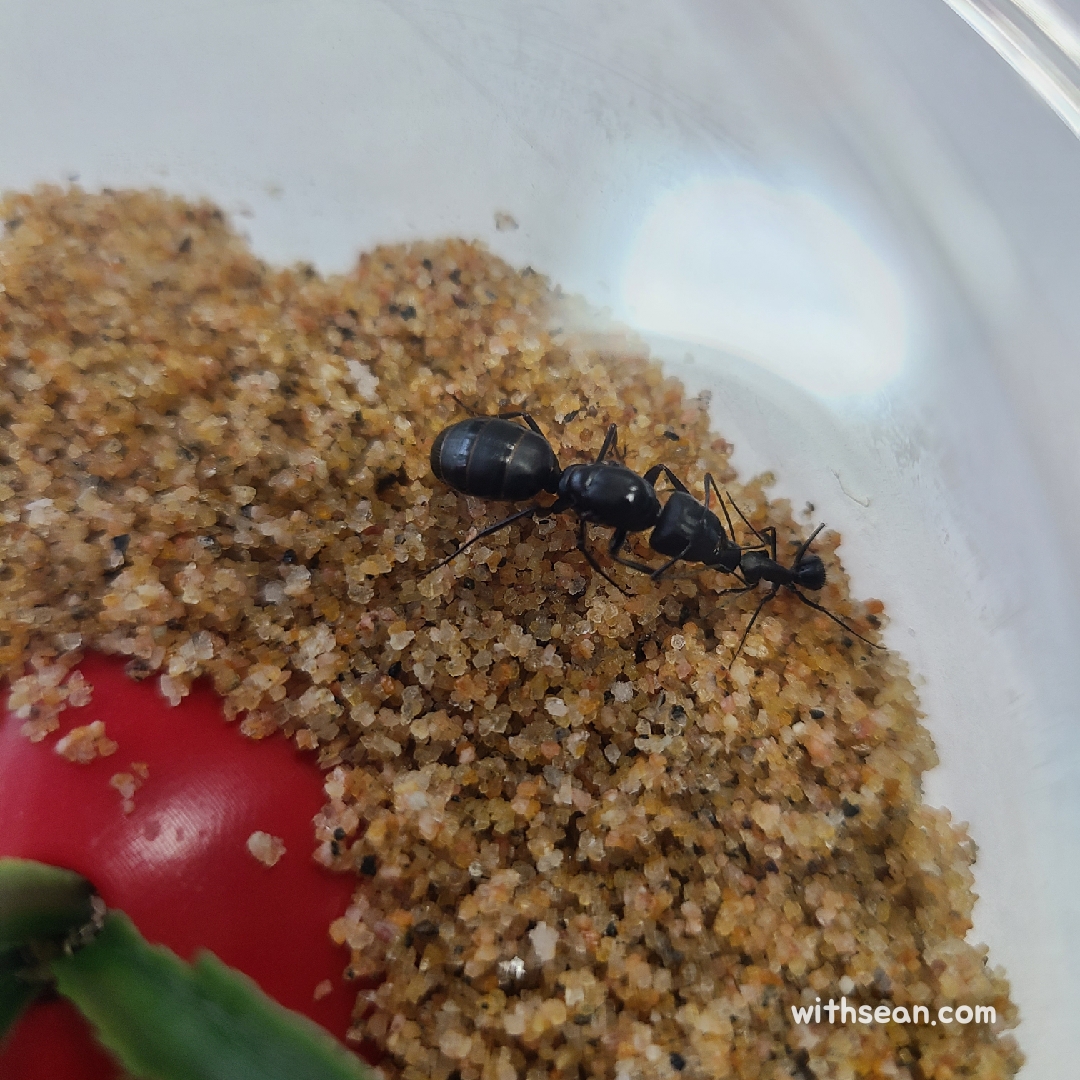 파란겔 집이었을 때는 굴을 파기 시작하는데만 3일 정도 걸렸는데, 이번에는 흙 위에 안착하자마자 일개미들이 열심히 흙 알맹이를 나르는 모습을 볼 수 있었어요.
