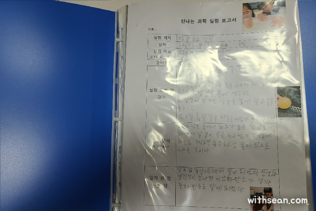 실험 중에 찍었던 사진도 뽑아서 같이 붙인 후, 투명 파일에 첫번째 과학실험보고서를 꽂아줬더니 너무 뿌듯해하네요.