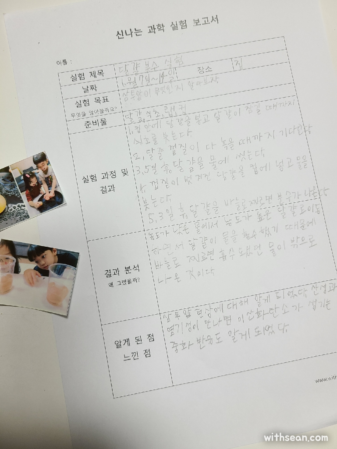 실험을 하는 과정 중간중간 셔니와 함께 과학 실험 보고서도 작성했어요.