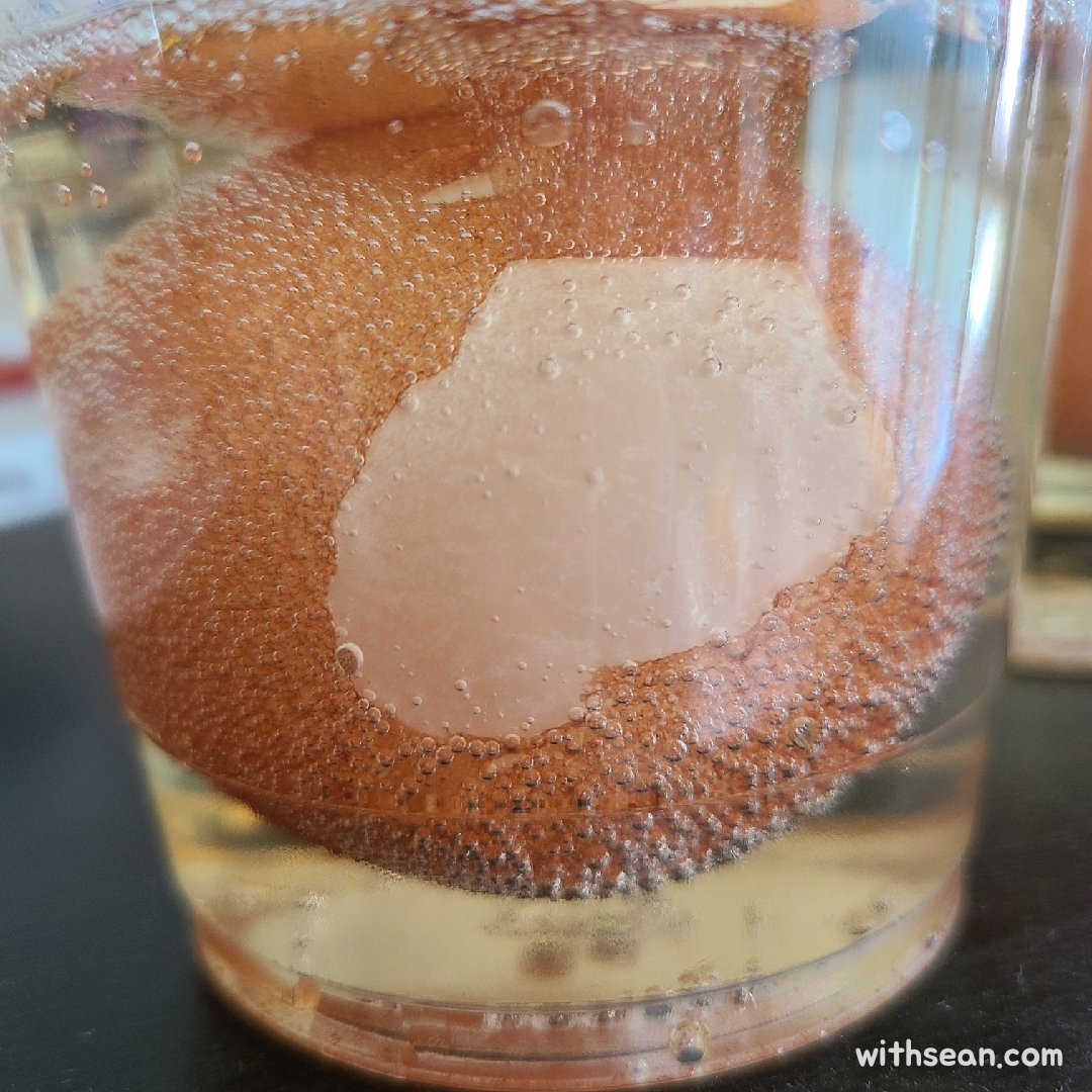 달걀 껍질과 식초가 만나자 부글부글. 이산화탄소가 나오기 시작했어요.