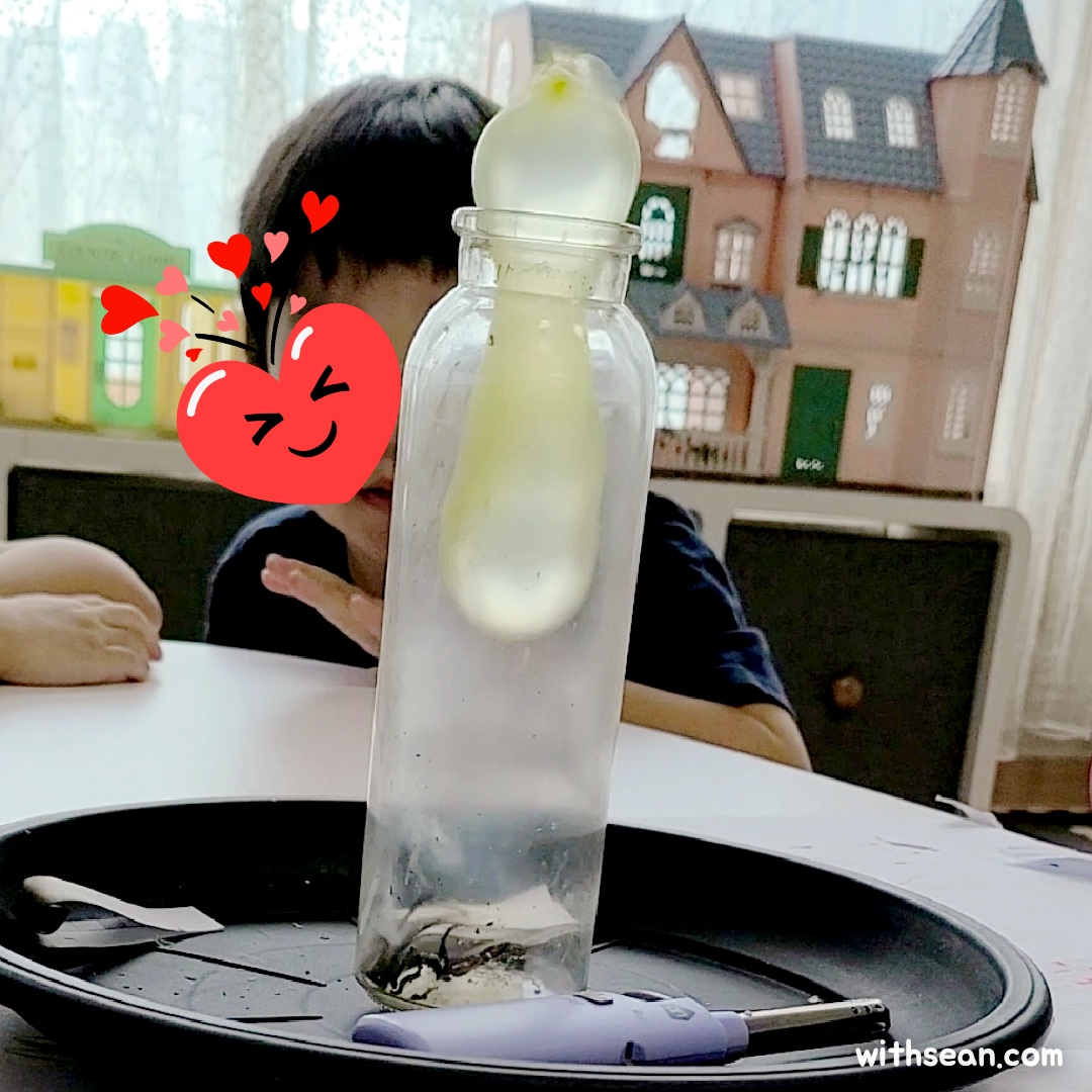 유리병 속 종이에 붙은 불이 꺼지고 난 후 풍선이 쭈우욱 빨려들어가는 것 보이시나요?