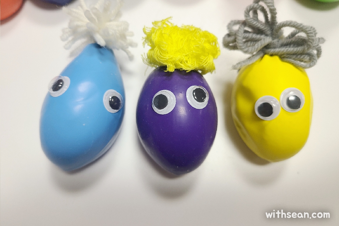 털실로 머리를 달아주고, 눈알을 붙여주면 훨씬 귀여운 말랑이 인형이 됩니다.
