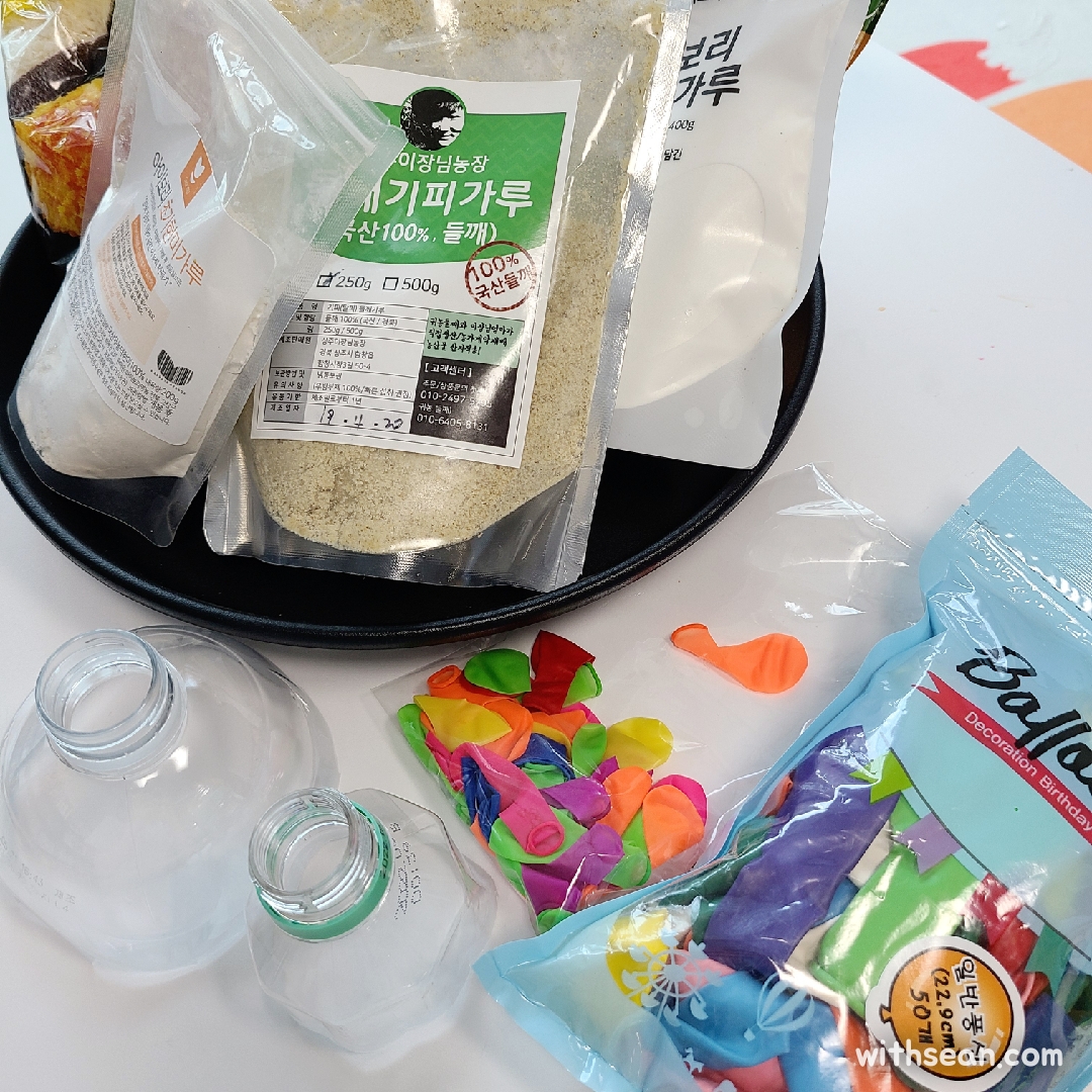 준비물 : 각종 가루, 풍선 (보통사이즈), 깔대기 (페트병 윗부분 활용)