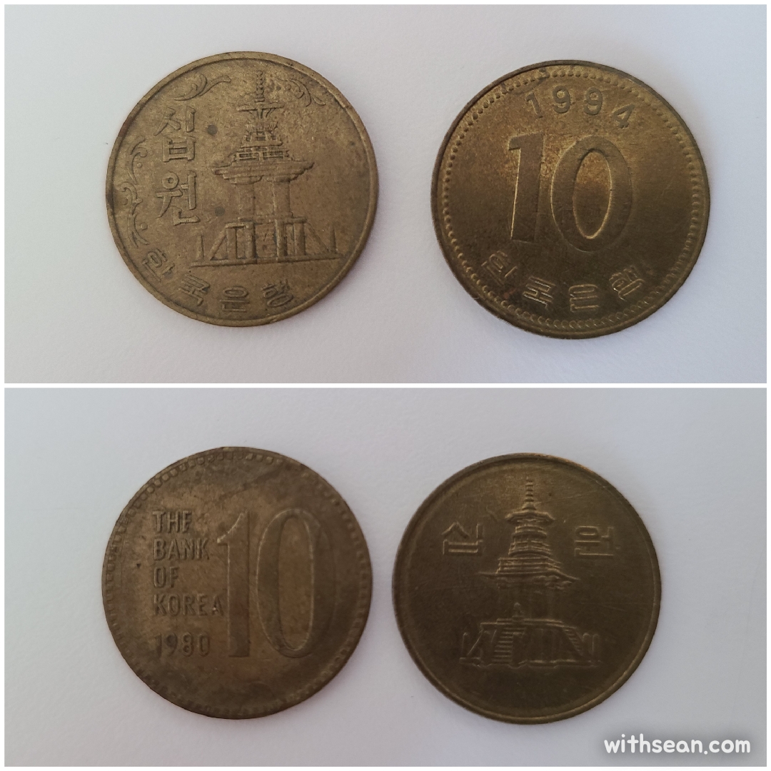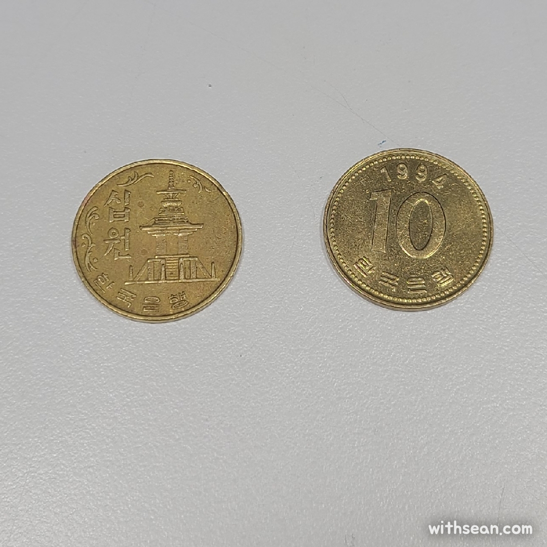 동전의 디자인도 달라진다는 것을 알려주며 구버전 10원과 신버전 10원 하나씩 준비했어요.
